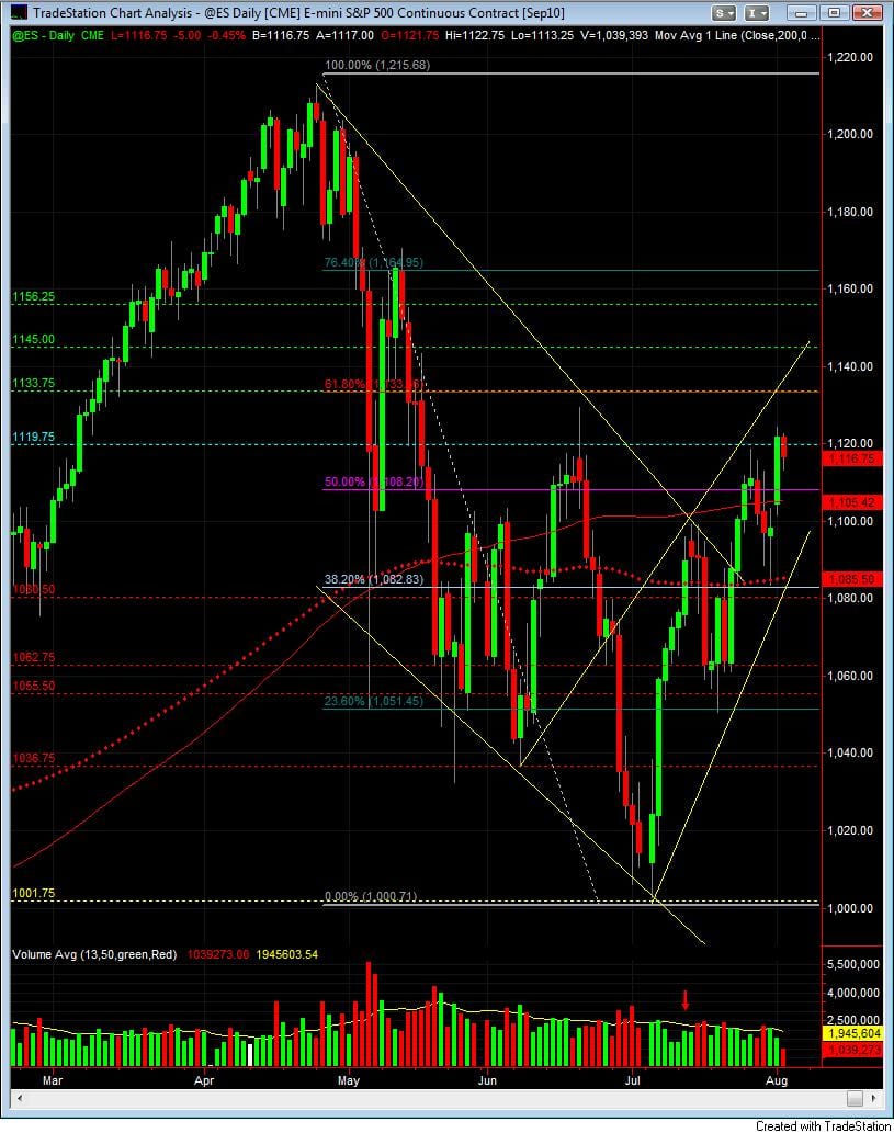 Since breaking the bearish channel at 1080.50 the market has moved up on lower volume. The first two weeks in August historically have had lower volume and if this past year is any indication of market performance we will probably see this move up.
